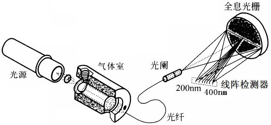 氣體分析儀的工作原理基于朗伯-比爾定律,其分析方法屬于紫外吸收光譜法。分析儀的測量單元,由光源、氣體室、光纖和光譜儀(含光闌、全息光柵、線陣檢測器)等組件構成。
