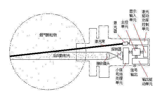 粉塵儀包括激光光源及功率控制單元、光電傳感與小信號預處理單元、散射光接收單元、顯示與輸入單元、輸出驅動單元、主控單元。激光器發(fā)出的650nm束以一個微小的角度射入排放源,激光束與煙塵粒子作用產(chǎn)生散射光,背向散射光通過接受系統(tǒng)進入傳感器轉變成電信號進行處理。電路部分實現(xiàn)光電轉換、激光束的調制、信號放大、解調、光源的功率控制、V/I轉換功能。整個系統(tǒng)的構成包括主機及校準系統(tǒng)、吹掃系統(tǒng)、連接附件及防雨箱。